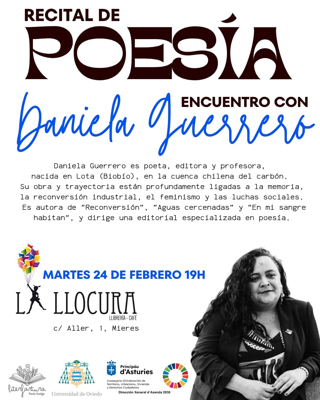 Como señalamos en la entrada anterior, comienzan las actividades con Daniela Guerrero. Una de ellas va a ser este Recital de Poesía en la Librería- Café La Llocura (Mieres) el 24 de febrero a las 19:00 h. Es por tanto la hora de preguntarnos ¿Quién es Daniela Guerrero?